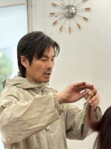 カットの技術で作るデザインの場合、スタッフ一同、お客様の髪質や生え癖、骨格をまずしっかり目で見て確認し、そして切る場所によってハサミを変えて切ったり、またはわざと切らなかったりしてデザインを作っていきます。
